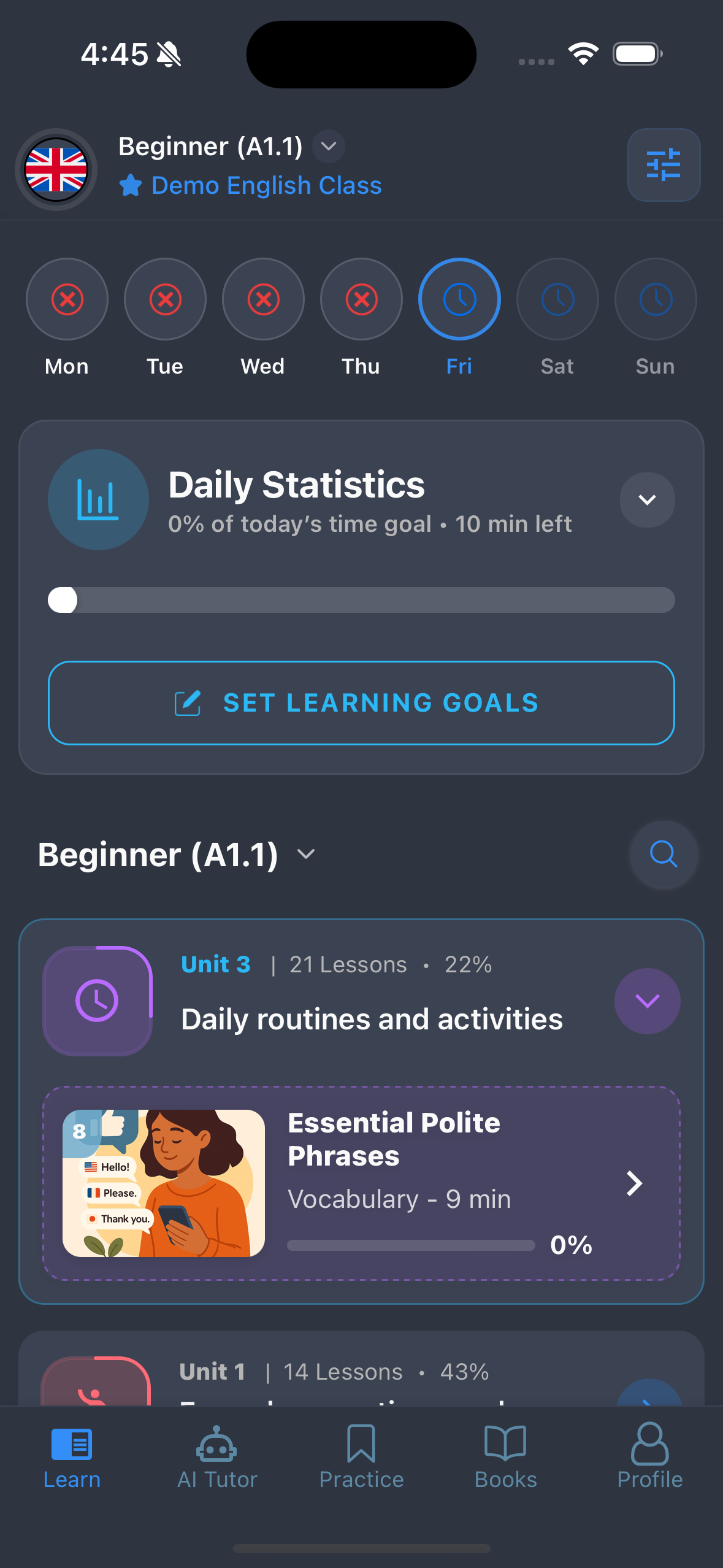Your lessons and daily goals adapt to your level — structured from beginner to advanced.