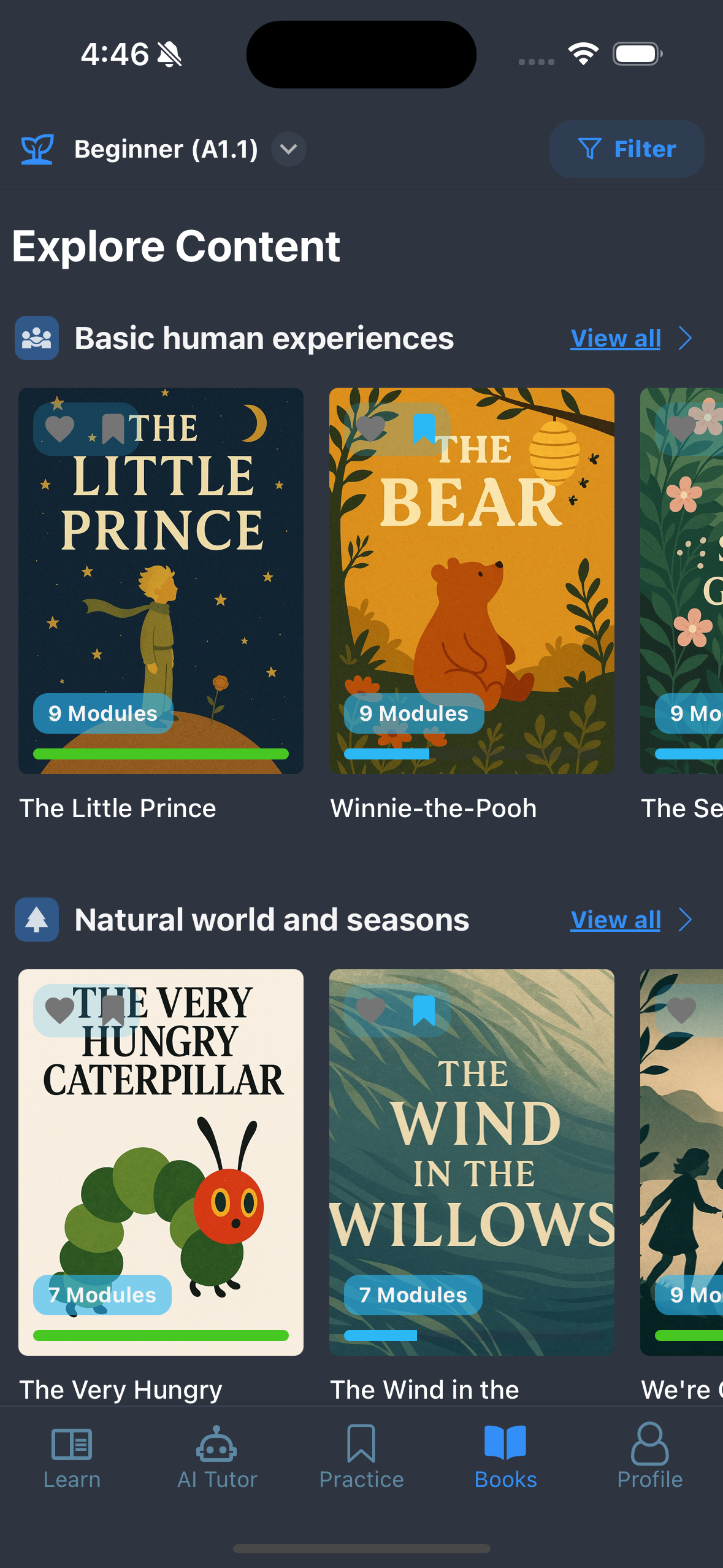 Read stories and book summaries with translation support — save unknown words to your Library.
