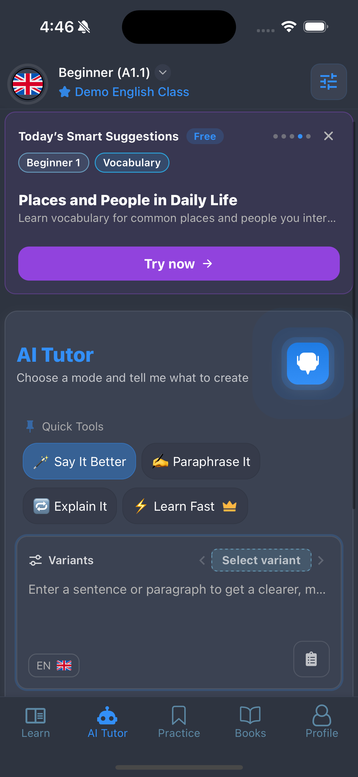 The AI Tutor improves your sentences, paraphrases your text, translates instantly, and recommends the best lessons for your needs.